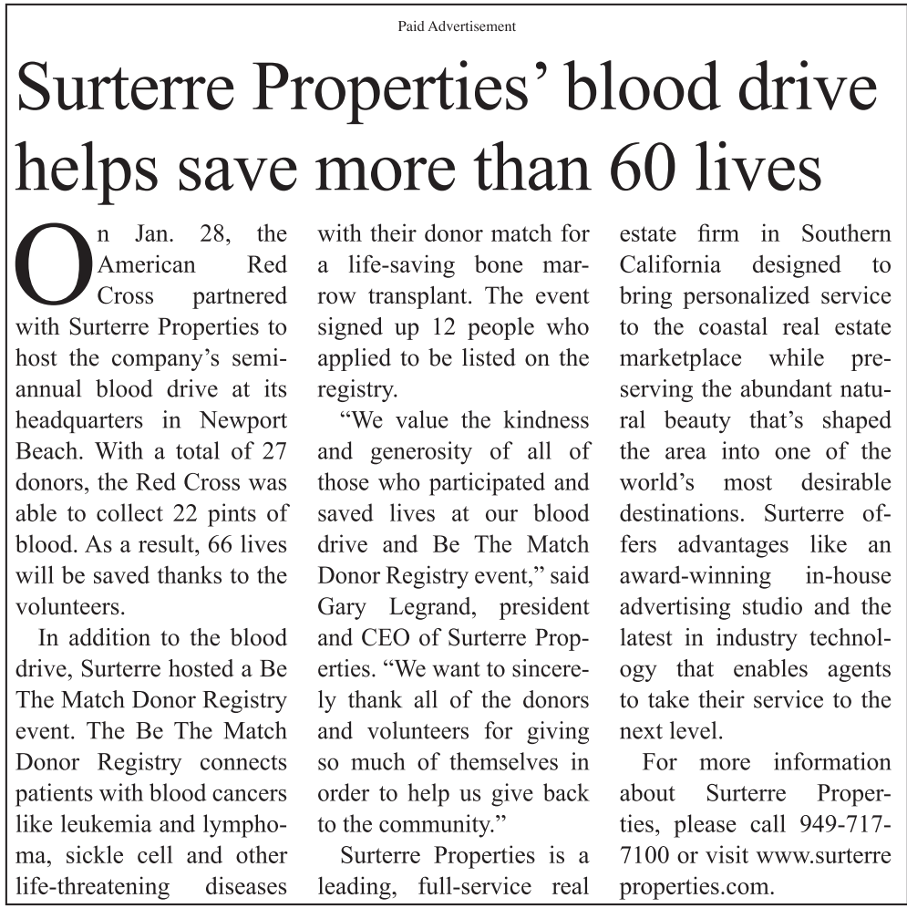 Jan. 28, the American Red Cross partnered with Surterre Properties to host the company’s semiannual blood drive at its headquarters in Newport Beach. With a total of 27 donors, the Red Cross was able to collect 22 pints of blood. As a result, 66 lives will be saved thanks to the volunteers.