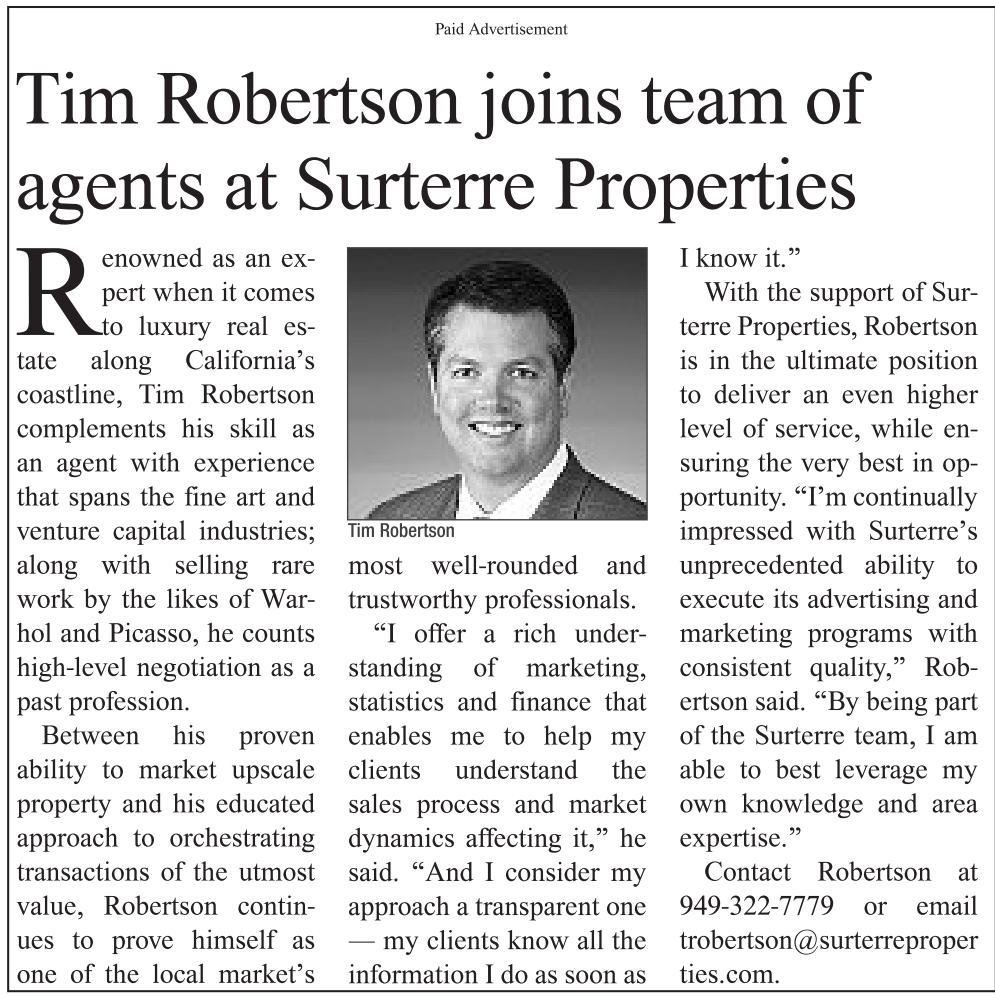 Contact Robertson at 949-322-7779 or email trobertson@surterreproper ties.com.