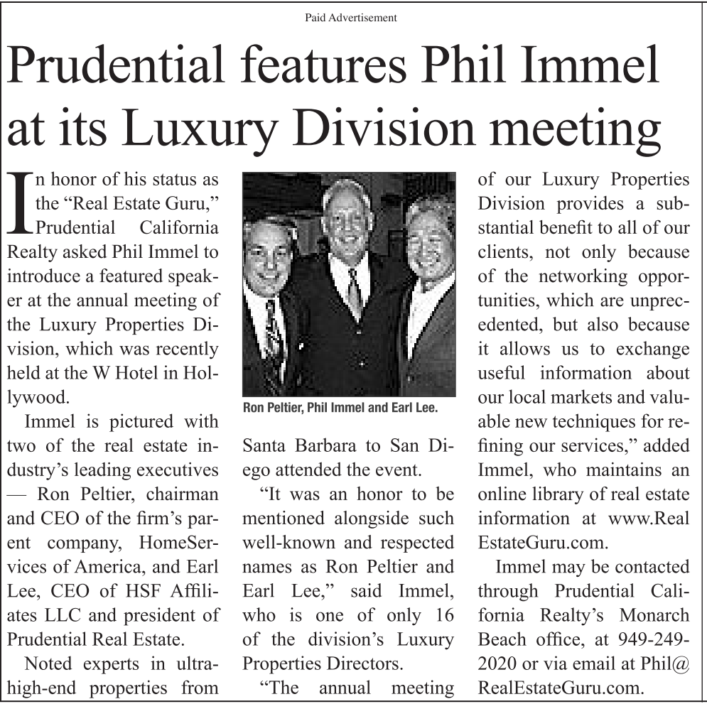 In honor of his status as the “Real Estate Guru,” Prudential California Realty asked Phil Immel to introduce a featured speaker at the annual meeting of the Luxury Properties Division, which was recently held at the W Hotel in Hollywood. Immel is pictured with two of the real estate industry’s leading executives — Ron Peltier, chairman and CEO of the firm’s parent company, HomeServices of America, and Earl Lee, CEO of HSF Affiliates LLC and president of Prudential Real Estate. Noted experts in ultrahigh-end properties from Paid Advertisement Prudential features Phil Immel at its Luxury Division meeting Ron Peltier,Phil Immel and Earl Lee. Santa Barbara to San Diego attended the event. “It was an honor to be mentioned alongside such well-known and respected names as Ron Peltier and Earl Lee,” said Immel, who is one of only 16 of the division’s Luxury Properties Directors. “The annual meeting of our Luxury Properties Division provides a substantial benefit to all of our clients, not only because of the networking opportunities, which are unprecedented, but also because it allows us to exchange useful information about our local markets and valuable new techniques for refining our services,” added Immel, who maintains an online library of real estate information at www.Real EstateGuru.com. Immel may be contacted through Prudential California Realty’s Monarch Beach office, at 949-249- 2020 or via email at Phil@ RealEstateGuru.com.