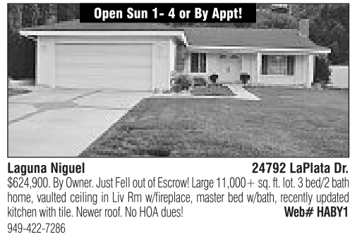 Laguna Niguel 949-422-7286 Open Sun 1- 4orByAppt! 24792 LaPlata Dr. $624,900. By Owner.Just Fell out of Escrow! Large11,000+ sq. ft. lot. 3bed/2 bath home, vaulted ceiling in Liv Rm w/fireplace, master bed w/bath, recently updated kitchen with tile. Newer roof.NoHOA dues! Web# HABY1