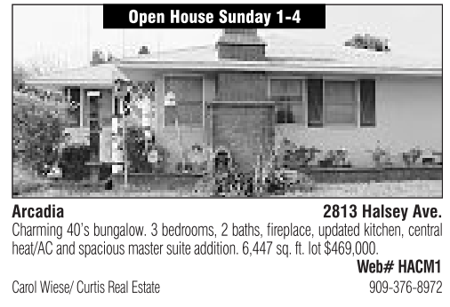 Arcadia Open House Sunday 1-4 2813 Halsey Ave. Charming 40’s bungalow. 3bedrooms, 2baths, fireplace, updated kitchen, central heat/AC and spacious master suite addition. 6,447 sq. ft. lot $469,000. Web# HACM1 Carol Wiese/ Curtis Real Estate 909-376-8972