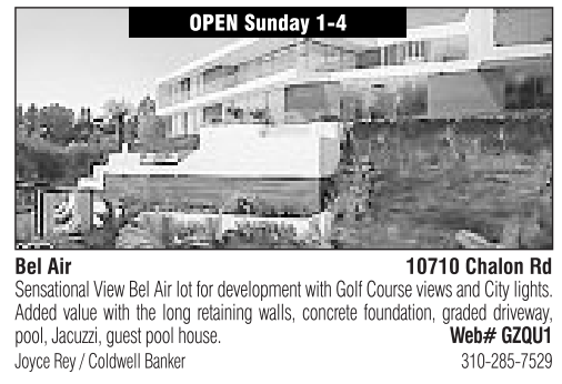 Bel Air OPEN Sunday 1-4 10710 Chalon Rd Joyce Rey/Coldwell Banker 310-285-7529 Sensational View Bel Air lot for development with Golf Course views and City lights. Added value with the long retaining walls, concrete foundation, graded driveway, pool, Jacuzzi, guest pool house. Web# GZQU1 See also