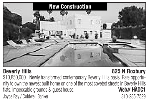 Beverly Hills New Construction 825 NRoxbury $10,850,000. Newly transformed contemporary Beverly Hills oasis. Rareopportunity to own the newest built home on one of the most coveted streets in Beverly Hills flats. Impeccable grounds &guest house. Web# HADC1 Joyce Rey/Coldwell Banker 310-285-7529 See also