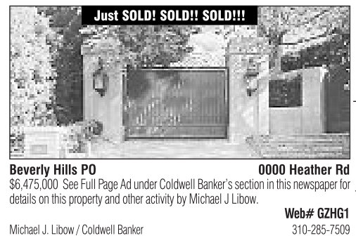 Beverly Hills PO Just SOLD! SOLD!! SOLD!!! 0000 Heather Rd $6,475,000 See Full Page Ad under Coldwell Banker’s section in this newspaper for details on this property and other activity by Michael JLibow. Web# GZHG1 Michael J. Libow /Coldwell Banker 310-285-7509 See also
