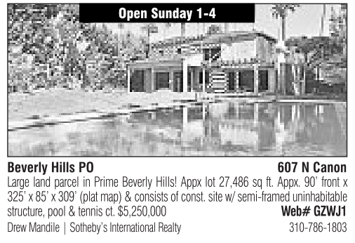 Large land parcel in Prime Beverly Hills! Appx lot 27,486 sq ft. Appx. 90’ front x 325’ x85’ x309’ (plat map) &consists of const. site w/ semi-framed uninhabitable structure, pool &tennis ct. $5,250,000 Web# GZWJ1