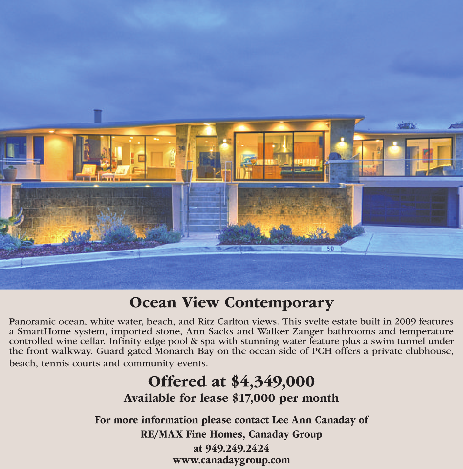 Ocean View Contemporary Panoramic ocean, white water, beach, and Ritz Carlton views. This svelte estate built in 2009 features a SmartHome system, imported stone, Ann Sacks and Walker Zanger bathrooms and temperature controlled wine cellar. Infinity edge pool & spa with stunning water feature plus a swim tunnel under the front walkway. Guard gated Monarch Bay on the ocean side of PCH offers a private clubhouse, beach, tennis courts and community events. Offered at $4,349,000 Available for lease $17,000 per month For more information please contact Lee Ann Canaday of RE/MAX Fine Homes, Canaday Group at 949.249.2424 www.canadaygroup.com
