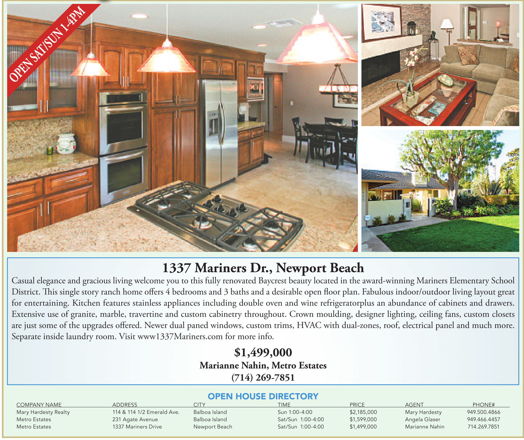 1337 Mariners Dr., Newport Beach Casual elegance and gracious living welcome you to this fully renovated Baycrest beauty located in the award-winning Mariners Elementary School District. This single story ranch home offers 4 bedrooms and 3 baths and a desirable open floor plan. Fabulous indoor/outdoor living layout great for entertaining. Kitchen features stainless appliances including double oven and wine refrigeratorplus an abundance of cabinets and drawers. Extensive use of granite, marble, travertine and custom cabinetry throughout. Crown moulding, designer lighting, ceiling fans, custom closets are just some of the upgrades offered. Newer dual paned windows, custom trims, HVAC with dual-zones, roof, electrical panel and much more. Separate inside laundry room. Visit www1337Mariners.com for more info. $1,499,000 Marianne Nahin, Metro Estates (714) 269-7851 OPEN HOUSE DIRECTORY COMPANY NAME ADDRESS CITY TIME PRICE AGENT PHONE# Mary Hardesty Realty 114&114 1/2 Emerald Ave. Balboa Island Sun 1:00-4:00 $2,185,000 Mary Hardesty 949.500.4866 Metro Estates 231 Agate Avenue Balboa Island Sat/Sun 1:00-4:00 $1,599,000 Angela Glaser 949.466.4457 Metro Estates 1337 Mariners Drive Newport Beach Sat/Sun 1:00-4:00 $1,499,000 Marianne Nahin 714.269.7851