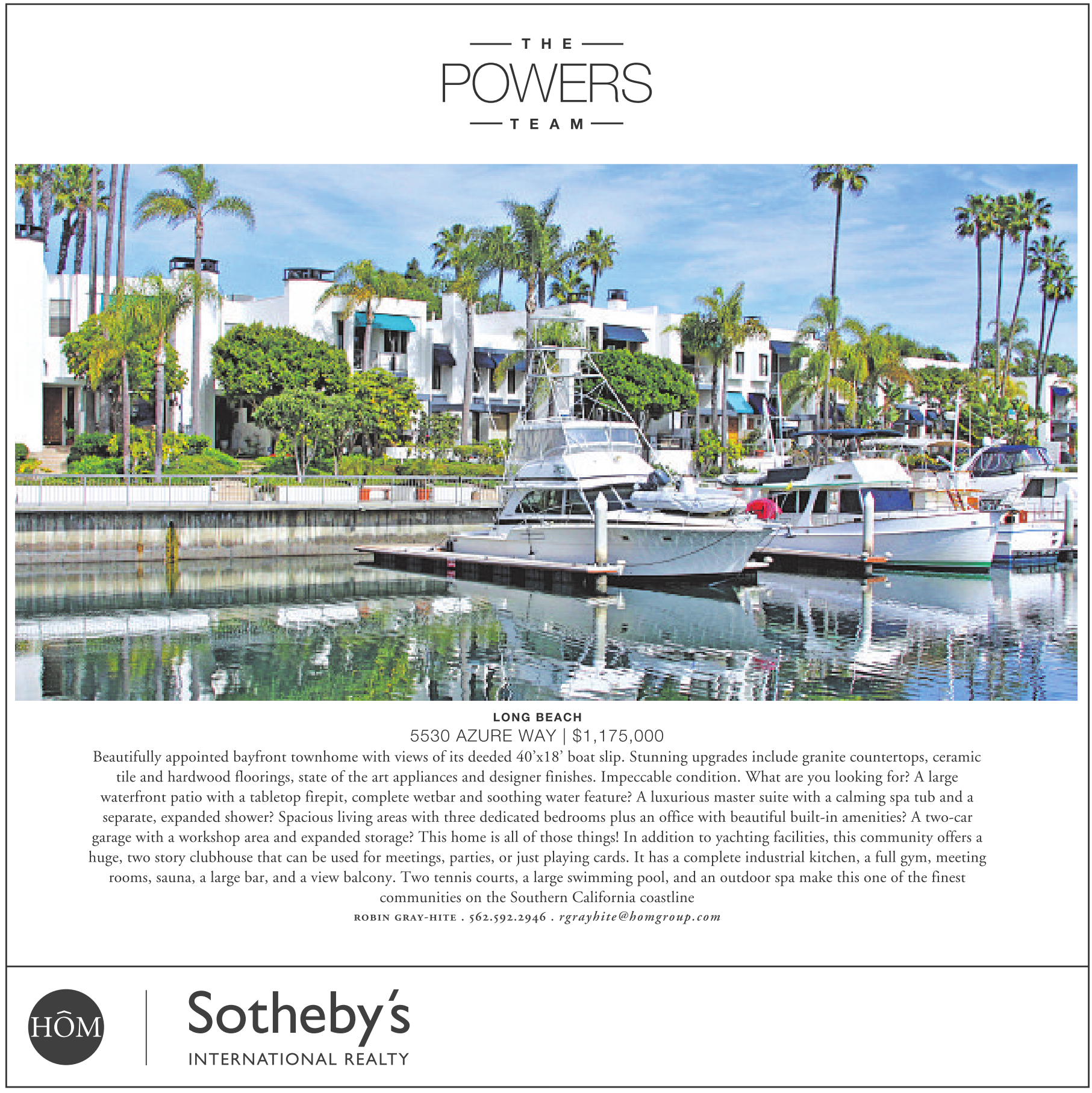 5530 AZURE WAY | $1,175,000 Beautifully appointed bayfront townhome with views of its deeded 40’x18’ boat slip. Stunning upgrades include granite countertops, ceramic tile and hardwood floorings, state of the art appliances and designer finishes. Impeccable condition. What are you looking for? A large waterfront patio with a tabletop firepit, complete wetbar and soothing water feature? A luxurious master suite with a calming spa tub and a separate, expanded shower? Spacious living areas with three dedicated bedrooms plus an office with beautiful built-in amenities? A two-car garage with a workshop area and expanded storage? This home is all of those things! In addition to yachting facilities, this community offers a huge, two story clubhouse that can be used for meetings, parties, or just playing cards. It has a complete industrial kitchen, a full gym, meeting rooms, sauna, a large bar, and a view balcony. Two tennis courts, a large swimming pool, and an outdoor spa make this one of the finest communities on the Southern California coastline robin gray-hite . 562.592.2946 . rgrayhite@homgroup.com