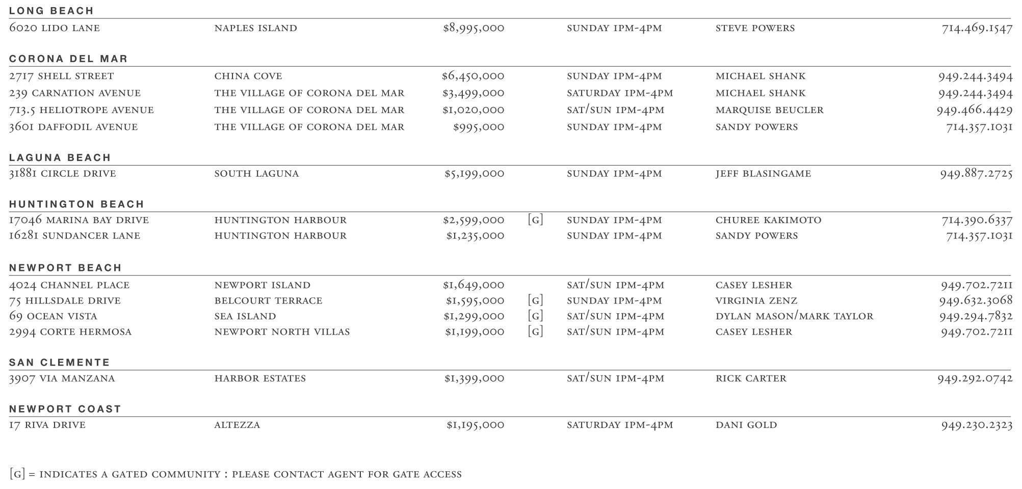2717 shell street china cove $6,450,000 sunday 1pm-4pm michael shank 949.244.3494 239 carnation avenue the village of corona del mar $3,499,000 saturday 1pm-4pm michael shank 949.244.3494 713.5 heliotrope avenue the village of corona del mar $1,020,000 sat/sun 1pm-4pm marquise beucler 949.466.4429 3601 daffodil avenue the village of corona del mar $995,000 sunday 1pm-4pm sandy powers 714.357.1031