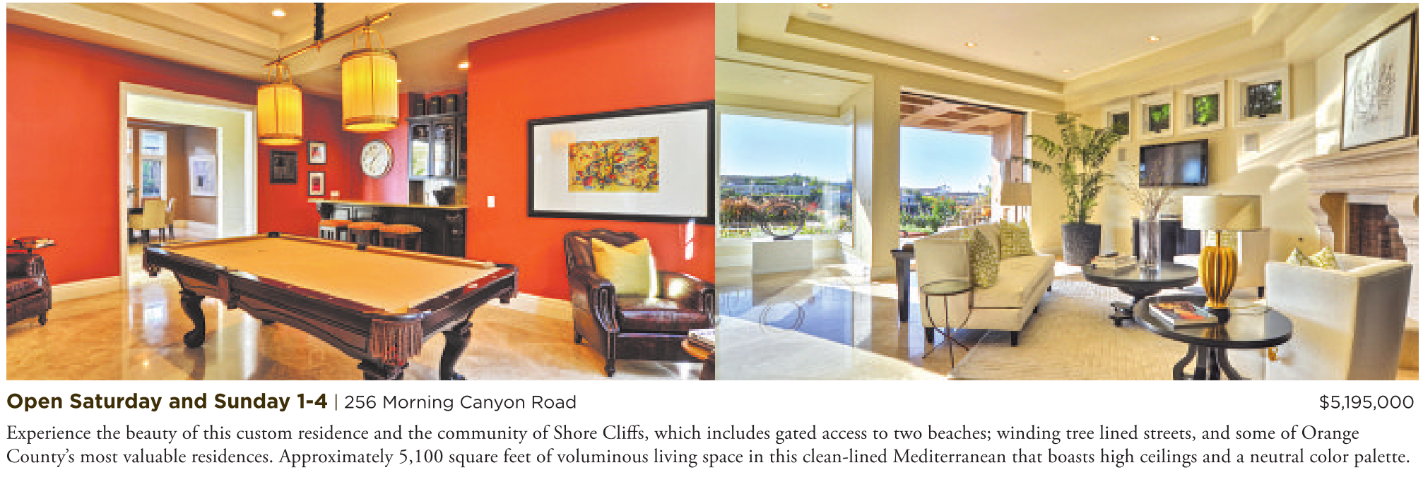 Open Saturday and Sunday 1-4 | 256 Morning Canyon Road $5,195,000 Experience the beauty of this custom residence and the community of Shore Cliffs, which includes gated access to two beaches; winding tree lined streets, and some of Orange County’s most valuable residences. Approximately 5,100 square feet of voluminous living space in this clean-lined Mediterranean that boasts high ceilings and a neutral color palette.