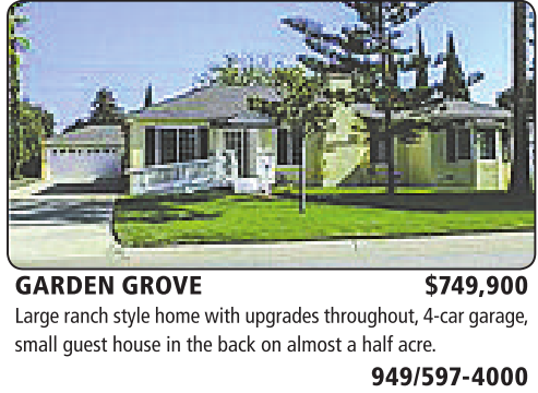 GARDEN GROVE $749,900 Large ranch style home with upgrades throughout, 4-car garage, smallguest house in the back on almost ahalf acre.