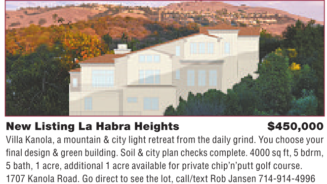 New Listing La Habra Heights $450,000 VillaKanola, amountain&citylight retreatfromthe daily grind. Youchooseyour final design&green building. Soil &cityplancheckscomplete. 4000 sq ft,5bdrm, 5bath, 1acre, additional 1acreavailablefor privatechip’n’puttgolf course. 1707 KanolaRoad. Go direct to see thelot, call/textRob Jansen 714-914-4996