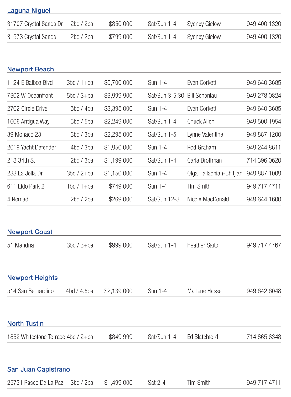 31707 Crystal Sands Dr 2bd /2ba $850,000 Sat/Sun 1-4 Sydney Gielow 949.400.1320 31573 Crystal Sands 2bd /2ba $799,000 Sat/Sun 1-4 Sydney Gielow 949.400.1320