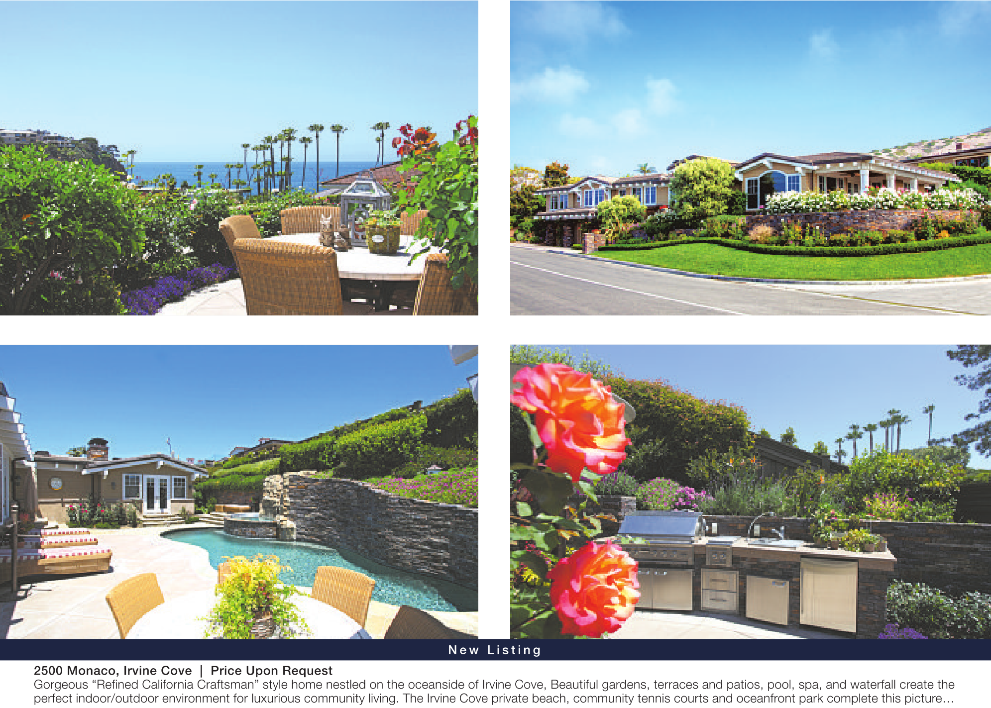 2500 Monaco, Irvine Cove | Price Upon Request Gorgeous “Refined California Craftsman” style home nestled on the oceanside of Irvine Cove, Beautiful gardens, terraces and patios, pool, spa, and waterfall create the perfect indoor/outdoor environment for luxurious community living. The Irvine Cove private beach, community tennis courts and oceanfront park complete this picture…