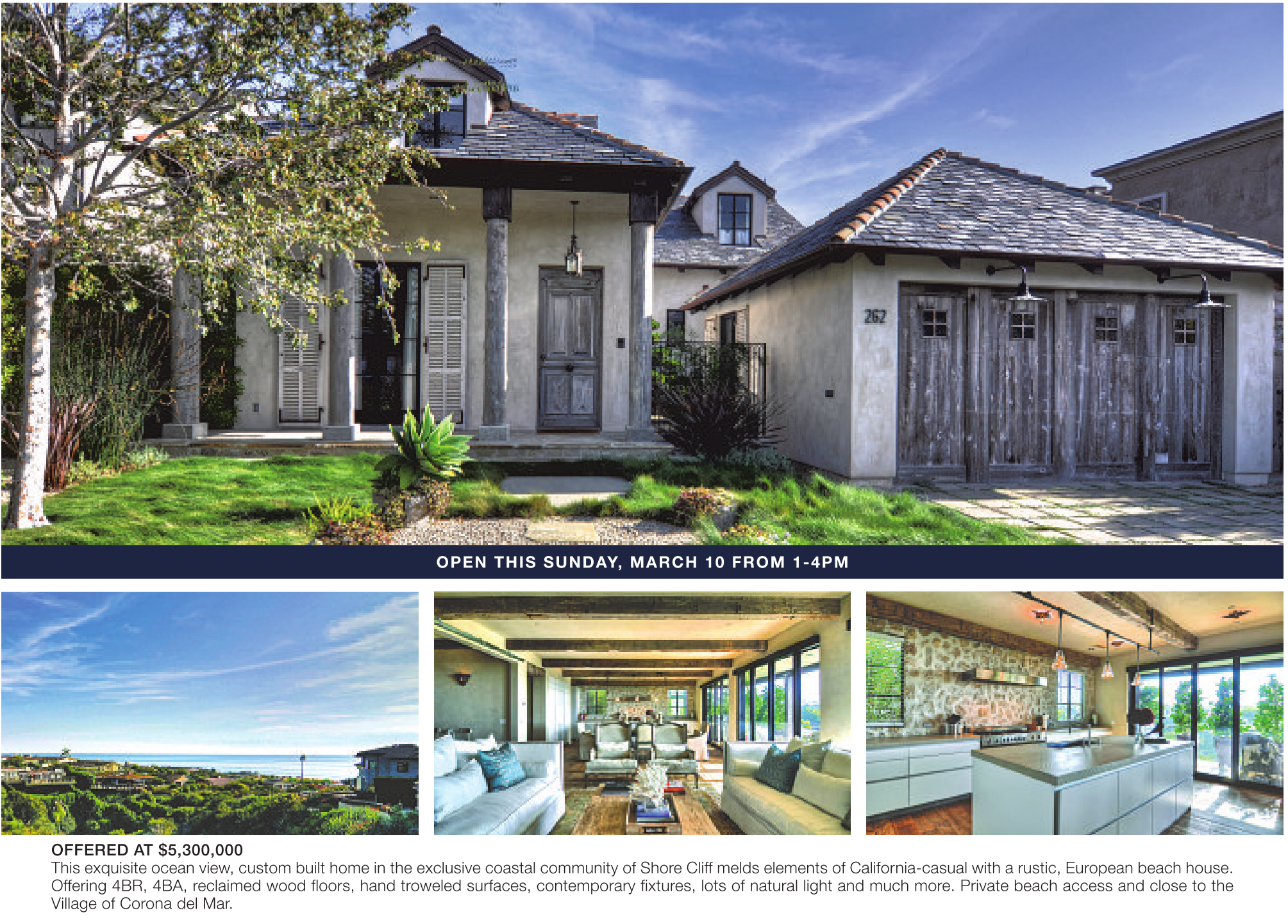 This exquisite ocean view, custom built home in the exclusive coastal community of Shore Cliff melds elements of California-casual with a rustic, European beach house.