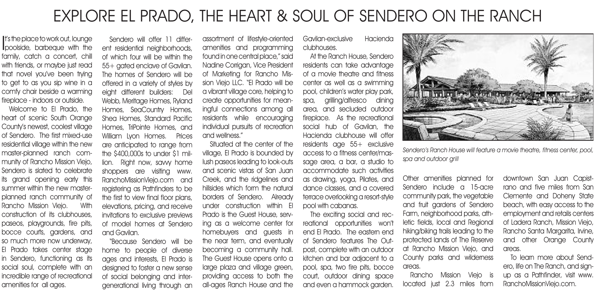 Shea Homes, Standard Pacific Homes, TriPointe Homes, and william Lyon Homes. Prices are anticipated to range from the $400,000s to under $1 million. Right now, savvy home shoppers are visiting www. RanchoMissionViejo.com and registering as Pathfinders to be the first to view final floor plans, elevations, pricing, and receive invitations to exclusive previews of model homes at Sendero and Gavilan.