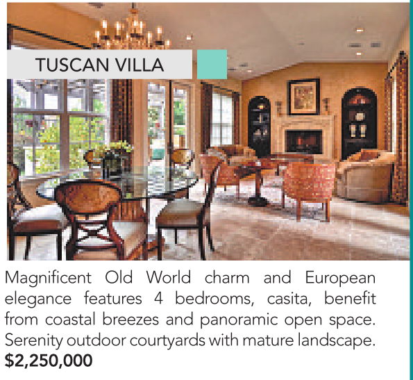 Magnificent Old World charm and European elegance features 4 bedrooms, casita, benefit from coastal breezes and panoramic open space. Serenity outdoor courtyards with maturelandscape. $2,250,000