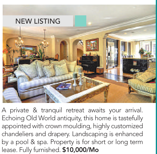 NEW LISTING A private & tranquil retreat awaits your arrival. Echoing Old World antiquity, this home is tastefully appointed with crown moulding, highly customized chandeliers and drapery. Landscaping is enhanced by a pool & spa. Property is for short or long term lease. Fully furnished. $10,000/Mo See also