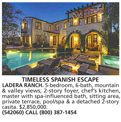 TIMELESS SPANISH ESCAPE LADERA RANCH. 5-bedroom, 6-bath, mountain & valley views, 2-story foyer, chef’s kitchen, master with spa-influenced bath, sitting area, private terrace, pool/spa & a detached 2-story casita. $2,850,000. (542060) CALL (800) 387-1454