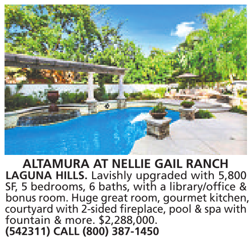 ALTAMURA AT NELLIE GAIL RANCH LAGUNA HILLS. Lavishly upgraded with 5,800 SF, 5 bedrooms, 6 baths, with a library/office & bonus room. Huge great room, gourmet kitchen, courtyard with 2-sided fireplace, pool &spa with fountain & more. $2,288,000. (542311) CALL (800) 387-1450