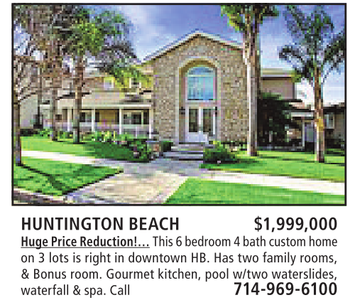 HUNTINGTON BEACH $1,999,000 HugePrice Reduction!… This 6bedroom 4bathcustomhome on 3lots isright in downtown HB. Has two family rooms, &Bonus room. Gourmet kitchen, pool w/two waterslides, waterfall&spa. Call 714-969-6100