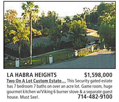 LA HABRA HEIGHTS $1,598,000 TwoOnALot Custom Estate… This Securitygated estate has7bedroom 7baths on overanacrelot.Gameroom, huge gourmet kitchen w/Viking 6burnerstove &aseparateguest house.MustSee!. 714-482-9100