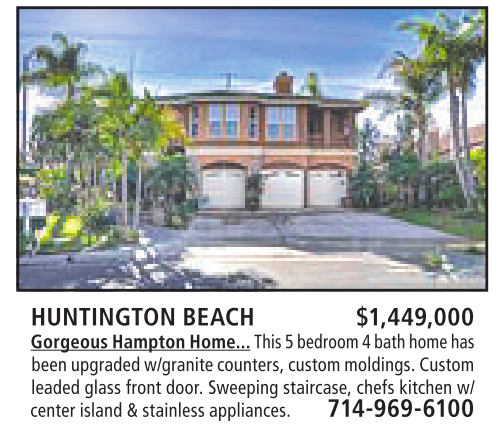 HUNTINGTON BEACH $1,449,000 GorgeousHamptonHome... This 5bedroom4bathhome has beenupgraded w/granite counters,custommoldings.Custom leaded glass front door. Sweeping staircase, chefs kitchen w/ centerisland&stainlessappliances. 714-969-6100