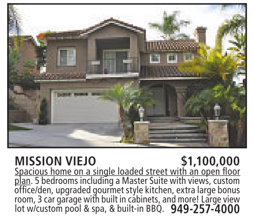 MISSION VIEJO $1,100,000 Spacious home on asingle loaded street with an open floor plan. 5bedroomsincluding aMasterSuitewithviews,custom office/den, upgraded gourmet stylekitchen,extra large bonus room,3car garagewithbuilt in cabinets, andmore!Large view lotw/custompool&spa,&built-inBBQ. 949-257-4000