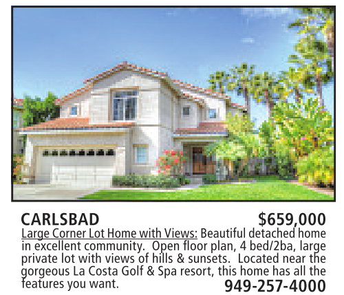 CARLSBAD $659,000 LargeCorner LotHome with Views: Beautifuldetached home in excellentcommunity. Openfloorplan, 4bed/2ba,large private lot with views of hills &sunsets. Located near the gorgeous La CostaGolf &Spa resort, this homehas allthe features youwant. 949-257-4000