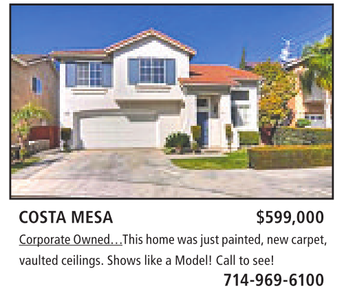 COSTA MESA $599,000 CorporateOwned…This homewas justpainted, new carpet, vaulted ceilings.Shows like aModel! Call to see!