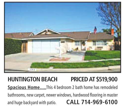 HUNTINGTONBEACH PRICED AT $519,900 Spacious Home.....This 4bedroom 2bath home has remodeled bathrooms, new carpet,newer windows, hardwood flooring in master andhugebackyard with patio. CALL 714-969-6100