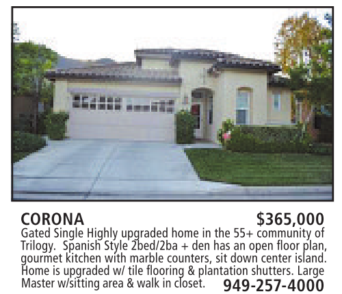 CORONA $365,000 Gated Single Highly upgraded home inthe 55+ community of Trilogy. Spanish Style 2bed/2ba +den has anopen floor plan, gourmet kitchen with marble counters, sit down center island. Home is upgraded w/ tile flooring &plantation shutters. Large Master w/sittingarea&walk in closet. 949-257-4000