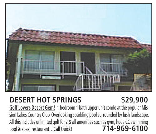 DESERT HOT SPRINGS $29,900 Golf Lovers DesertGem! 1bedroom1bathupper unit condoatthe popular Mission LakesCountryClub-Overlooking sparklingpoolsurrounded by lush landscape. Allthis includes unlimitedgolf for 2&all amenitiessuch as gym, huge CC swimming pool&spas, restaurant…CallQuick! 714-969-6100