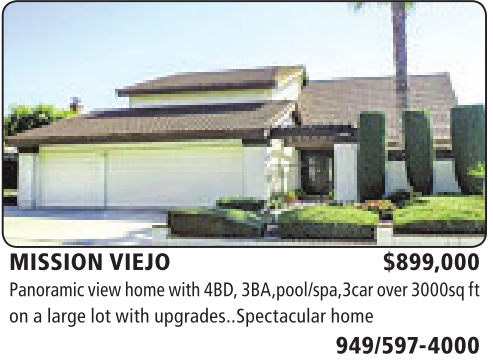 MISSION VIEJO $899,000 Panoramic view home with 4BD, 3BA,pool/spa,3car over3000sq ft on alarge lotwithupgrades..Spectacularhome 949/597-4000