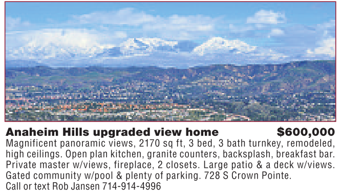 Anaheim Hills upgraded view home $600,000 Magnificent panoramic views, 2170 sq ft, 3 bed, 3 bath turnkey, remodeled, high ceilings. Open plan kitchen, granitecounters, backsplash, breakfast bar. Private master w/views, fireplace, 2 closets. Large patio & a deck w/views. Gated community w/pool & plenty of parking. 728 S Crown Pointe. Call or text Rob Jansen 714-914-4996
