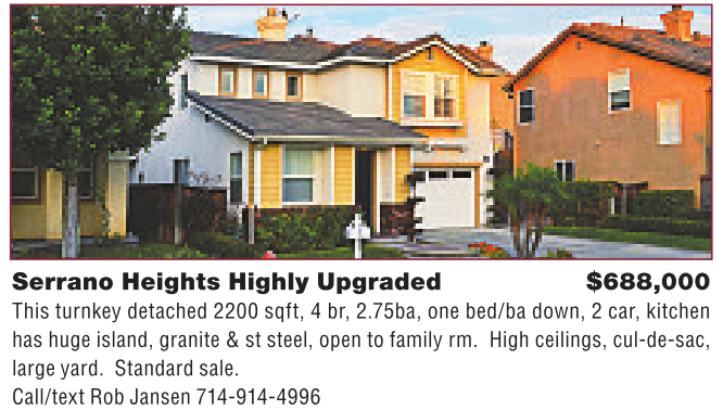 Serrano Heights Highly Upgraded $688,000 This turnkey detached 2200 sqft, 4br, 2.75ba, one bed/ba down, 2car, kitchen has huge island, granite &ststeel, open tofamily rm. High ceilings, cul-de-sac, largeyard. Standard sale. Call/text Rob Jansen 714-914-4996