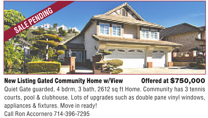 New Listing Gated Community Home w/View Offered at$750,000 Quiet Gate guarded, 4bdrm, 3bath, 2612 sq ft Home. Community has 3tennis courts, pool &clubhouse. Lots of upgrades such as double pane vinyl windows, appliances &fixtures. Moveinready! Call Ron Accornero 714-396-7295