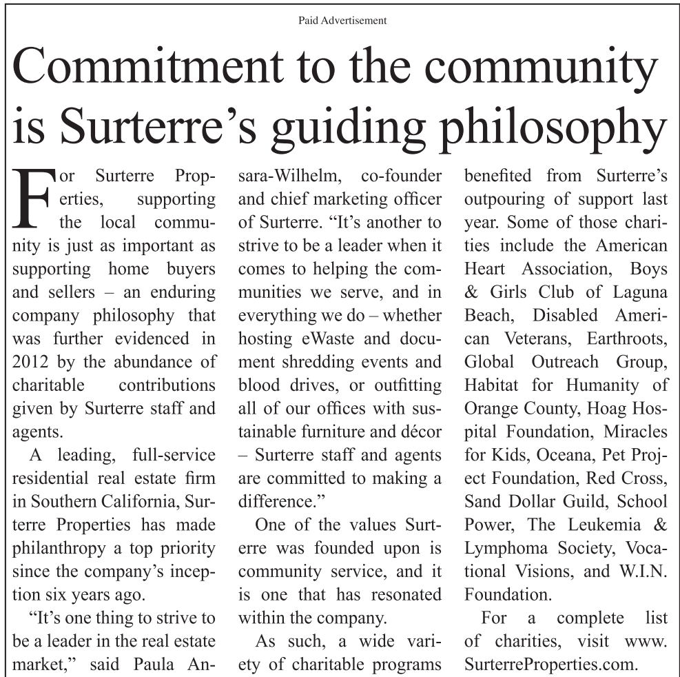 benefited from Surterre’s outpouring of support last year. Some of those charities include the American Heart Association, Boys & Girls Club of Laguna Beach, Disabled American Veterans, Earthroots, Global Outreach Group, Habitat for Humanity of Orange County, Hoag Hospital Foundation, Miracles for Kids, Oceana, Pet Project Foundation, Red Cross, Sand Dollar Guild, School Power, The Leukemia & Lymphoma Society, Vocational Visions, and W.I.N.