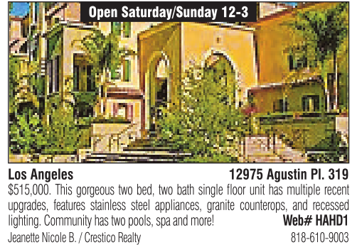 Open Saturday/Sunday 12-3 LosAngeles 12975 Agustin Pl. 319 Jeanette Nicole B. /Crestico Realty 818-610-9003 $515,000. This gorgeous two bed, two bath single floor unit has multiple recent upgrades, features stainless steel appliances, granite counterops, and recessed lighting. Community has two pools, spa and more! Web# HAHD1
