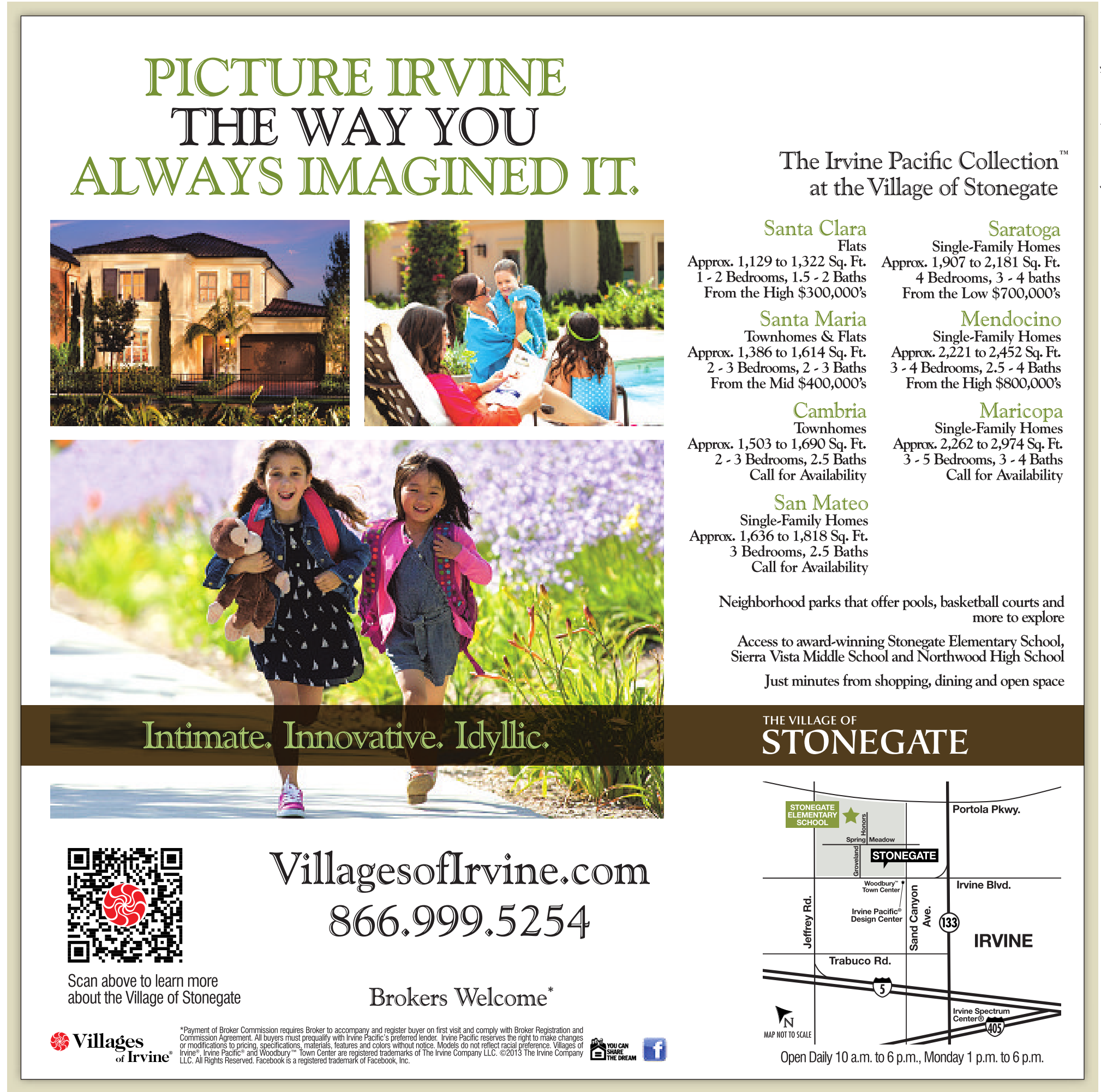 *Payment of Broker Commission requires Broker to accompany and register buyer on first visit and comply with Broker Registration and Commission Agreement. All buyers must prequalifywith Irvine Pacific’s preferred lender. Irvine Pacific reserves the right to make changes or modifications to pricing, specifications, materials, features and colors without notice. Models do not reflect racial preference. Villages of Irvine ® ,Irvine Pacific ® and Woodbury™ Town Center are registered trademarks of The Irvine Company LLC. ©2013 The Irvine Company LLC. All Rights Reserved. Facebook is aregistered trademark of Facebook, Inc.
