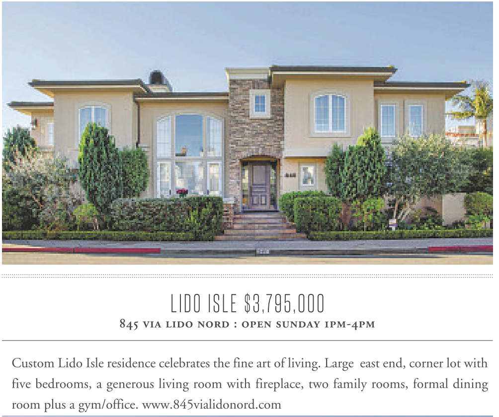 LIDO ISLE $3,795,000 845 via lido nord : open sunday 1pm-4pm Custom Lido Isle residence celebrates the fine art of living. Large east end, corner lot with five bedrooms, a generous living room with fireplace, two family rooms, formal dining room plus a gym/office. www.845vialidonord.com