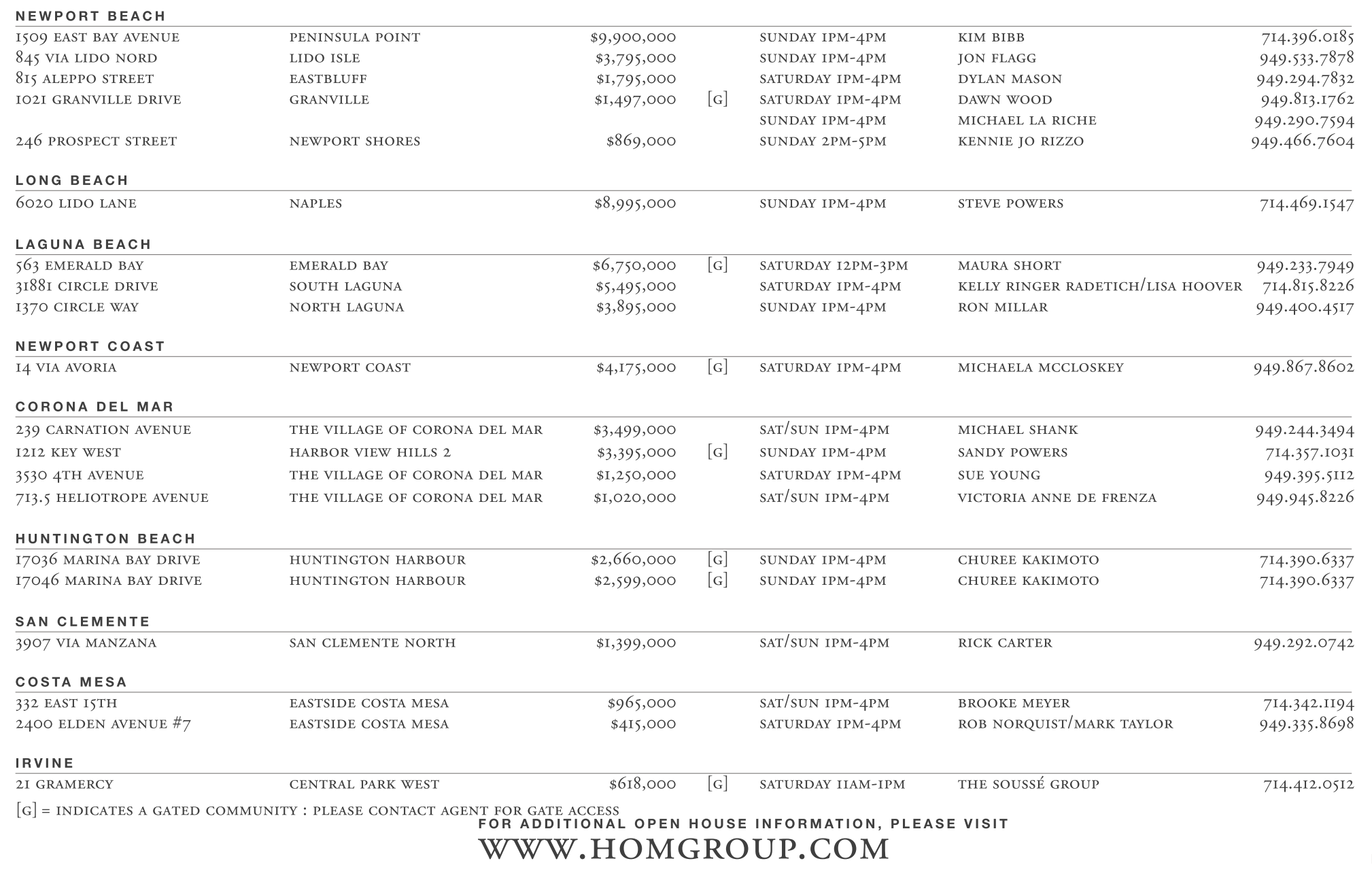 NEWPORT BEACH 1509 east bay avenue peninsula point $9,900,000 sunday 1pm-4pm kim bibb 714.396.0185 845 via lido nord lido isle $3,795,000 sunday 1pm-4pm jon flagg 949.533.7878 815 aleppo street eastbluff $1,795,000 saturday 1pm-4pm dylan mason 949.294.7832 1021 granville drive granville $1,497,000 [g] saturday 1pm-4pm dawn wood 949.813.1762 sunday 1pm-4pm michael la riche 949.290.7594 246 prospect street newport shores $869,000 sunday 2pm-5pm kennie jo rizzo 949.466.7604