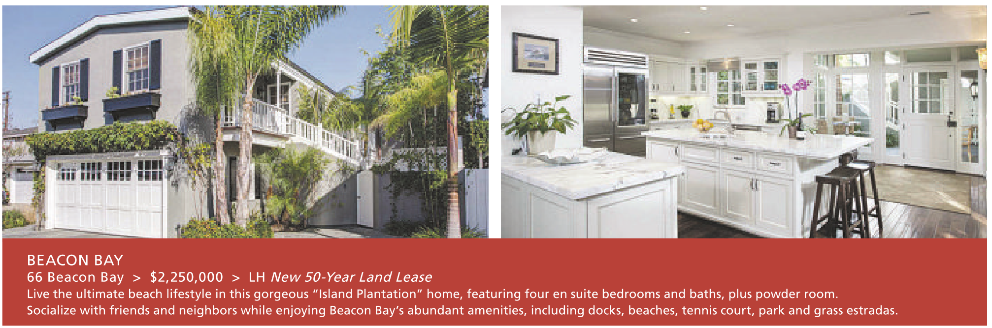 BEACON BAY 66 Beacon Bay > $2,250,000 > LH New 50-Year Land Lease Live the ultimate beach lifestyle in this gorgeous “Island Plantation” home, featuring four en suite bedrooms and baths, plus powder room. Socialize with friends and neighbors while enjoying Beacon Bay’s abundant amenities, including docks, beaches, tennis court, park and grass estradas.