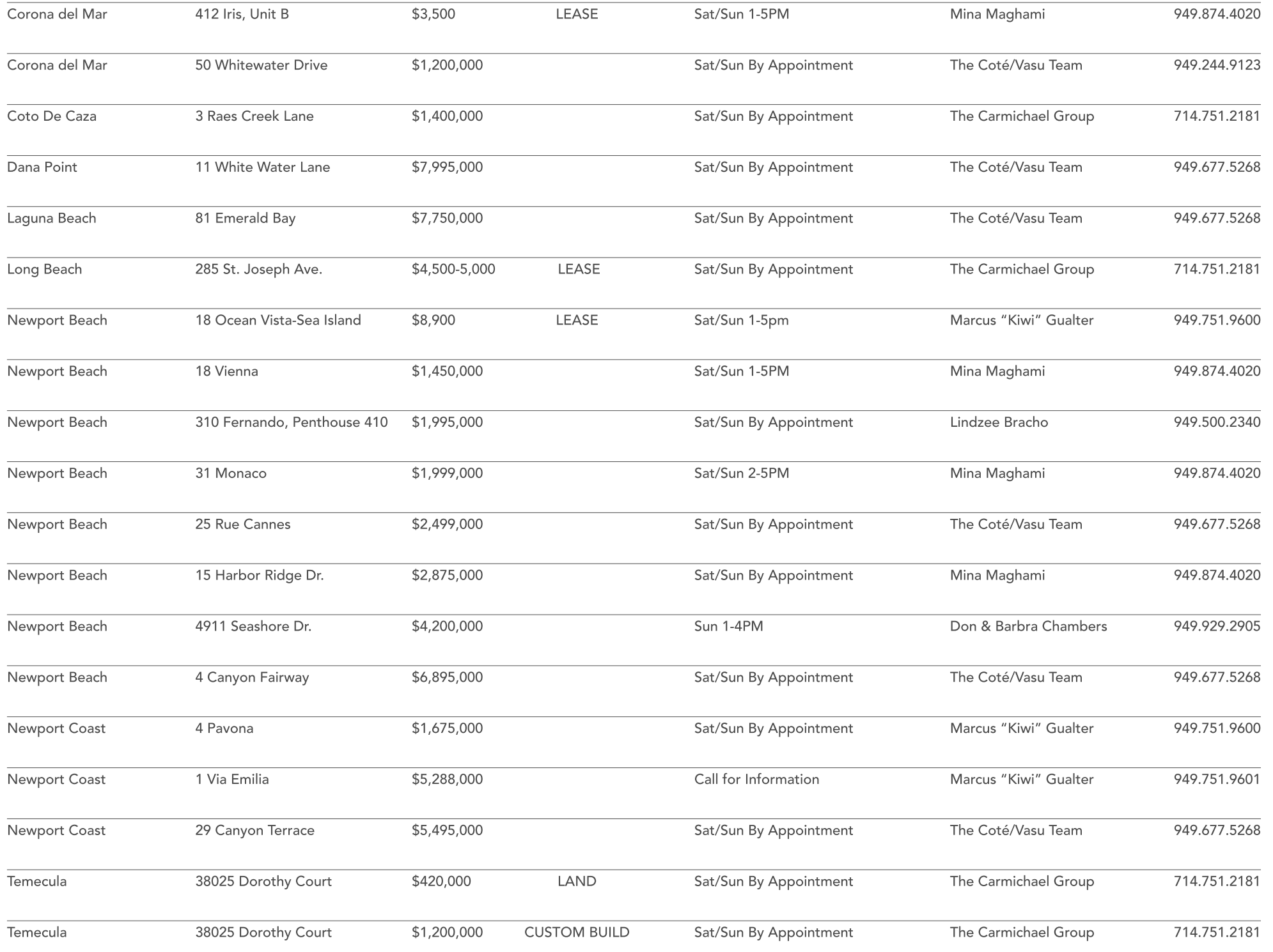 Newport Coast 4 Pavona $1,675,000 Sat/Sun By Appointment Marcus “Kiwi” Gualter 949.751.9600