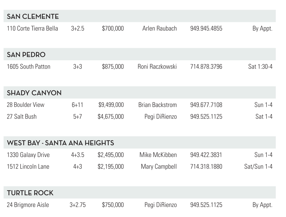 ShaDyCanyon 28 Boulder View 6+11 $9,499,000 Brian Backstrom 949.677.7108 Sun 1-4 27 Salt Bush 5+7 $4,675,000 Pegi DiRienzo 949.525.1125 Sat 1-4