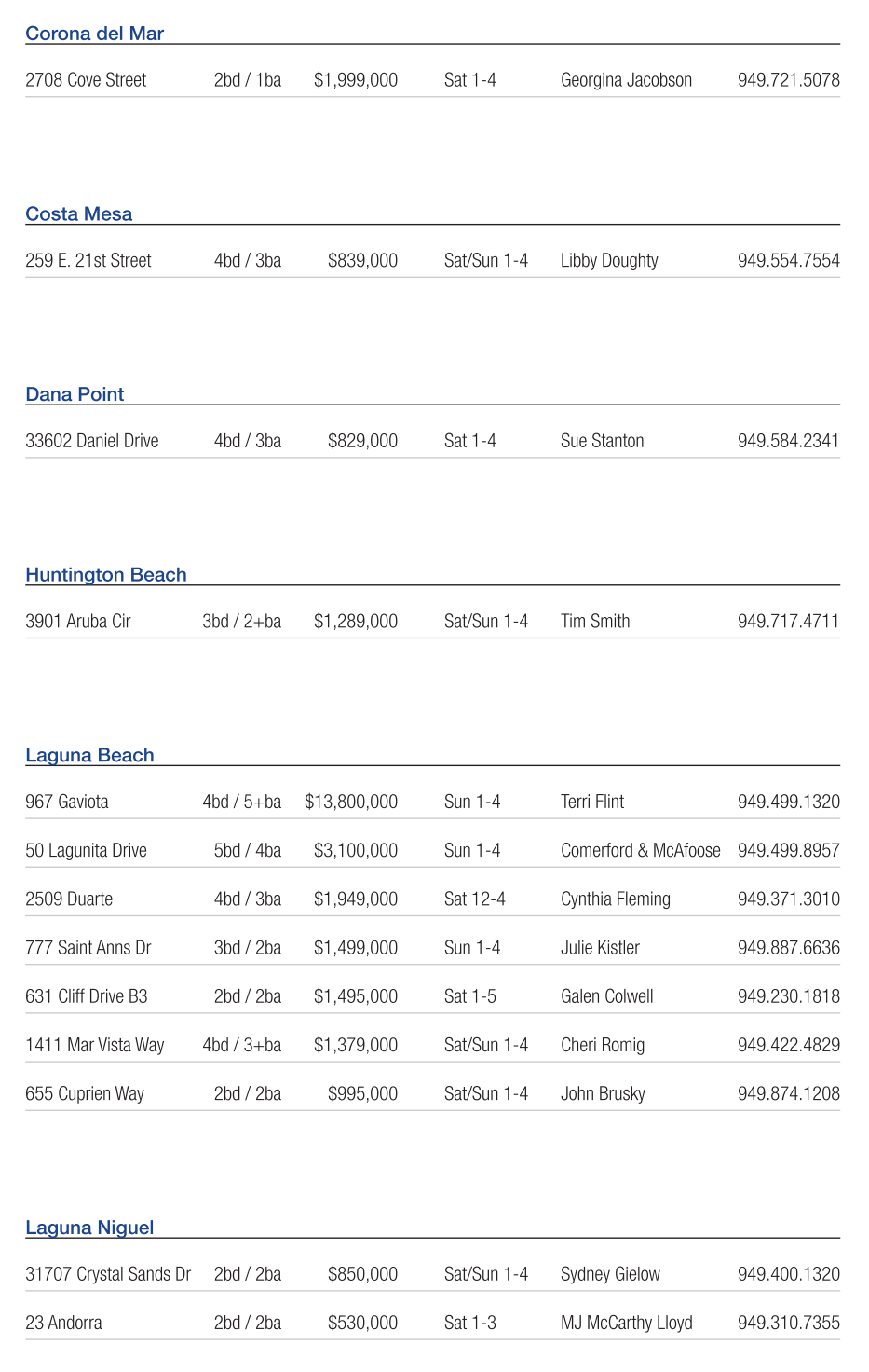 50 Lagunita Drive 5bd /4ba $3,100,000 Sun 1-4 Comerford &McAfoose 949.499.8957