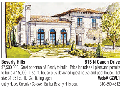 Beverly Hills 615 NCanon Drive $7,500,000. Great opportunity! Ready to build! Price includes all plans and permits to build a15,000 +sq. ft. house plus detached guest house and pool house. Lot size 31,851 sq. ft. Call listing agent. Web# GZVL1 Cathy Hodes Greenly /Coldwell Banker Beverly Hills South 310-850-4512