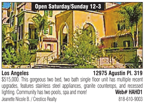 Open Saturday/Sunday 12-3 Los Angeles 12975 Agustin Pl. 319 $515,000. This gorgeous two bed, two bath single floor unit has multiple recent upgrades, features stainless steel appliances, granite counterops, and recessed lighting. Community has two pools, spa and more! Web# HAHD1 Jeanette Nicole B. /Crestico Realty 818-610-9003