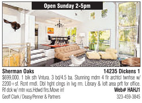 Open Sunday 2-5pm Sherman Oaks 14235 Dickens 1 $699,000. 1blk sth Vntura. 3bd/4.5 ba. Stunning mdrn 4flrarchtcl twnhse w/ 2200+sf. Rcnt rmdl. Dbl hght clngs in lvg rm. Library &loft area prft for office. Rf dck w/ mtn vus.Hdwd flrs.Move in! Web# HAHJ1 Geoff Clark /Deasy/Penner &Partners 323-459-3845