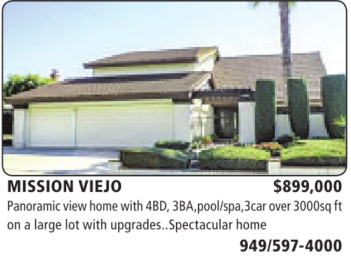 MISSION VIEJO $899,000 Panoramic view home with 4BD, 3BA,pool/spa,3car over3000sq ft on alarge lotwithupgrades..Spectacularhome 949/597-4000